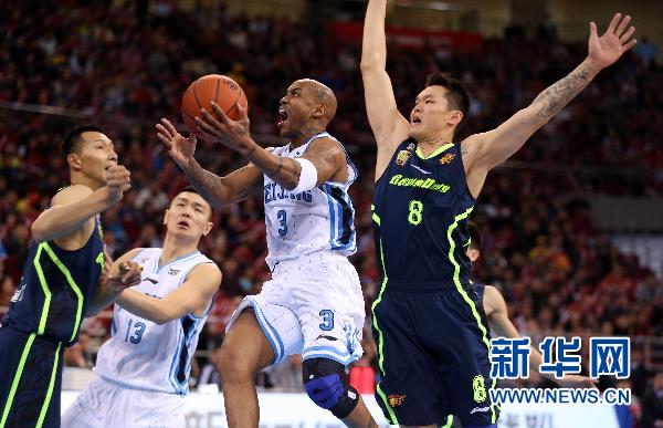 3月4日,北京金隅隊(duì)球員馬布里(右二)在廣東東莞銀行隊(duì)球員易建聯(lián)(左一)、朱芳雨(右一)的防守下上籃。當(dāng)日,在2013-2014賽季中國(guó)男子籃球職業(yè)聯(lián)賽(CBA)季后賽半決賽第一場(chǎng)比賽中,廣東東莞銀行隊(duì)客場(chǎng)87-90不敵北京金隅隊(duì)。新華社記者韓巖攝