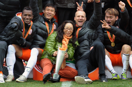 圖為貴州人和俱樂(lè)部董事長(zhǎng)戴秀麗(中)在超級(jí)杯奪冠儀式上和隊(duì)員一起慶祝(2014年2月16日攝)。