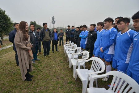 圖為艾如(左一)在成都與力達(dá)士俱樂(lè)部球員們交流,為他們加油鼓勁(2014年2月16日攝)。