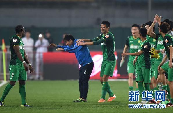 4月7日,北京國安隊(duì)舊將、現(xiàn)廣州富力隊(duì)球員王曉龍(左二)在比賽后向球迷致意。