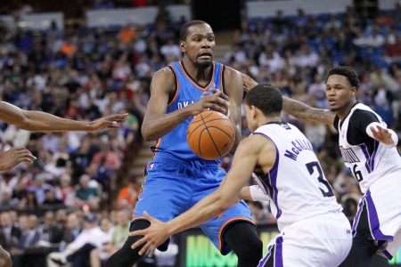 4月8日,雷鳴隊(duì)球員杜蘭特(左)在比賽中被國(guó)王隊(duì)球員麥卡勒姆(中)偷襲。