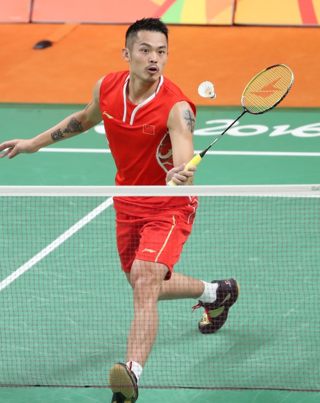 圖為2016年8月11日,左手持拍的中國選手林丹在里約奧運會羽毛球男單小組賽中回球。