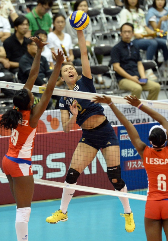 圖為2015年8月30日,左手持球的中國(guó)隊(duì)球員曾春蕾(中)在女排世界杯對(duì)陣古巴隊(duì)的比賽中扣球。