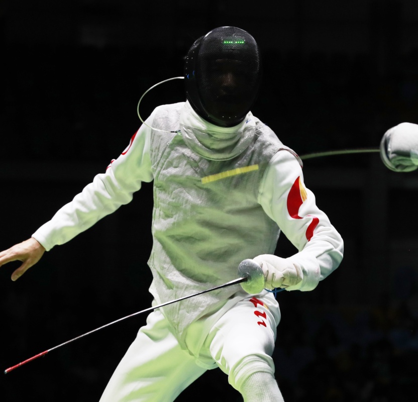 圖為2016年8月7日,左手持劍的中國選手雷聲在里約奧運會男子花劍個人賽32強賽中。
