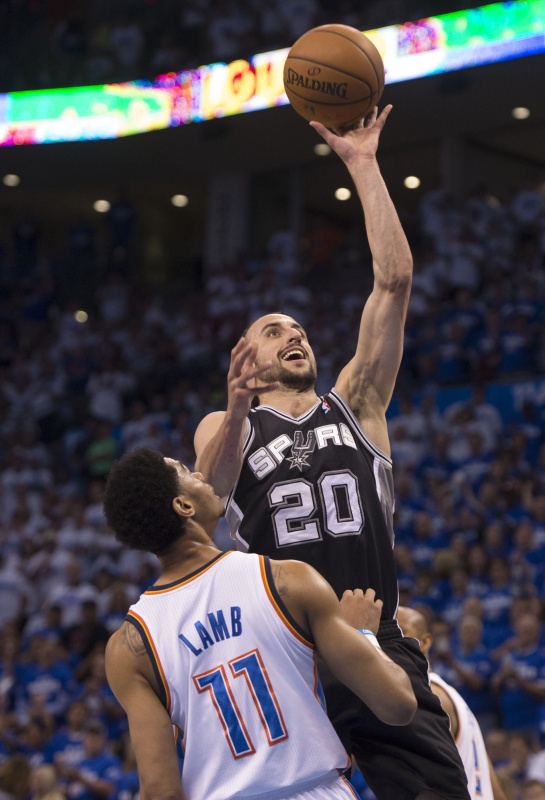 圖為2014年5月27日,左手持球的馬刺隊球員吉諾比利(右)在2013-2014賽季NBA季后賽西部決賽第四場比賽中投籃。
