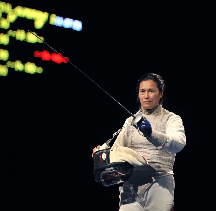 圖為2008年8月11日,左手持劍的加拿大選手欒菊杰在北京奧運會女子花劍個人1/32決賽中。