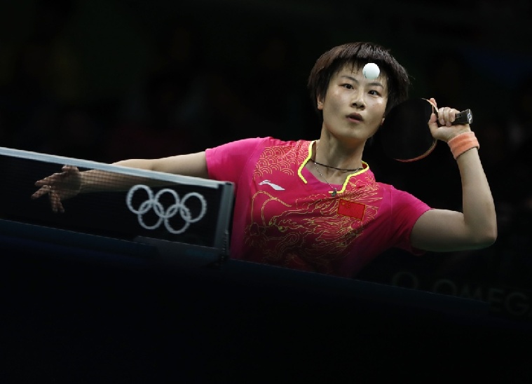 圖為2016年8月10日,左手持拍的中國選手丁寧在里約奧運(yùn)會乒乓球女單決賽中回球。丁寧在決賽中以4比3戰(zhàn)勝同胞李曉霞,奪得冠軍。