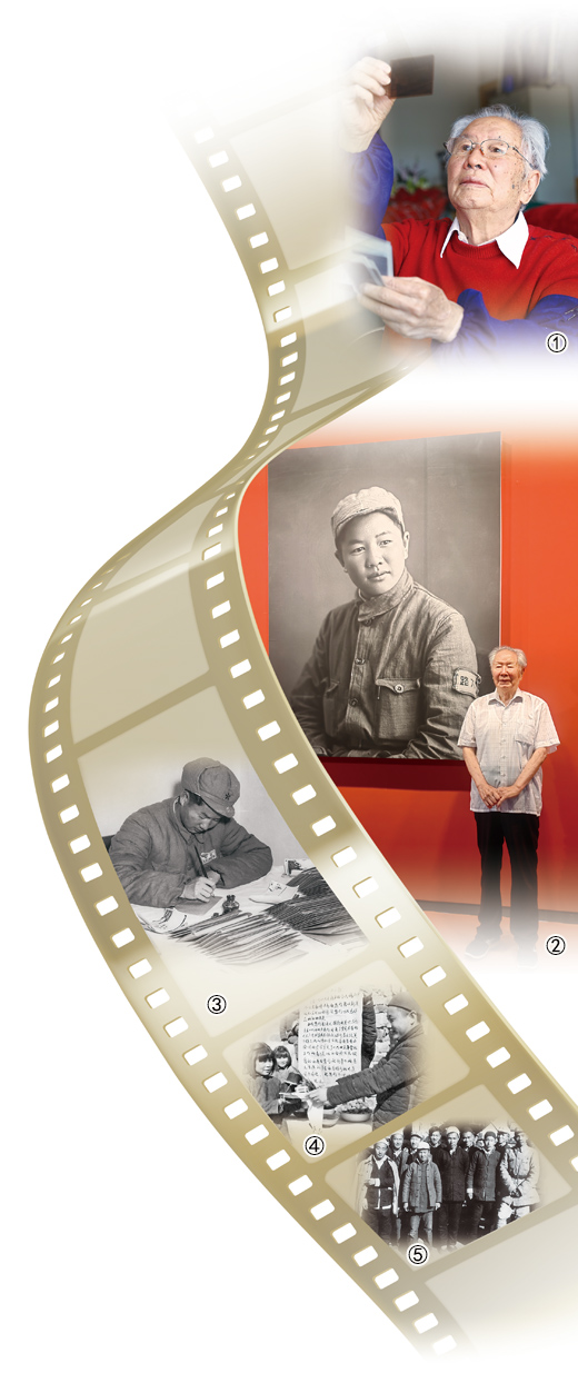 ▲圖①:顧棣在查看底片。圖②:在晉察冀邊區(qū)革命紀念館,顧棣與自己1945年的照片合影。圖③:1949年冬,顧棣在北京整理開國大典的影像材料。圖④:顧棣拍攝的1945年阜平城關春節(jié)的景象。圖⑤:1944年,顧棣(前排左二)與晉察冀畫報社戰(zhàn)友合影?!?/span>上述照片由受訪者提供