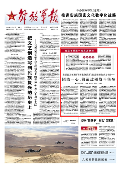 即日起,解放軍報(bào)通過“黨旗在基層一線高高飄揚(yáng)”欄目,集中宣傳黨的十九大以來軍隊(duì)基層黨建工作的創(chuàng)新實(shí)踐和豐碩成果,介紹基層黨組織發(fā)揮戰(zhàn)斗堡壘作用典型經(jīng)驗(yàn),展示廣大黨員發(fā)揮先鋒模范作用的感人事跡,為黨的二十大勝利召開營造濃厚氛圍。