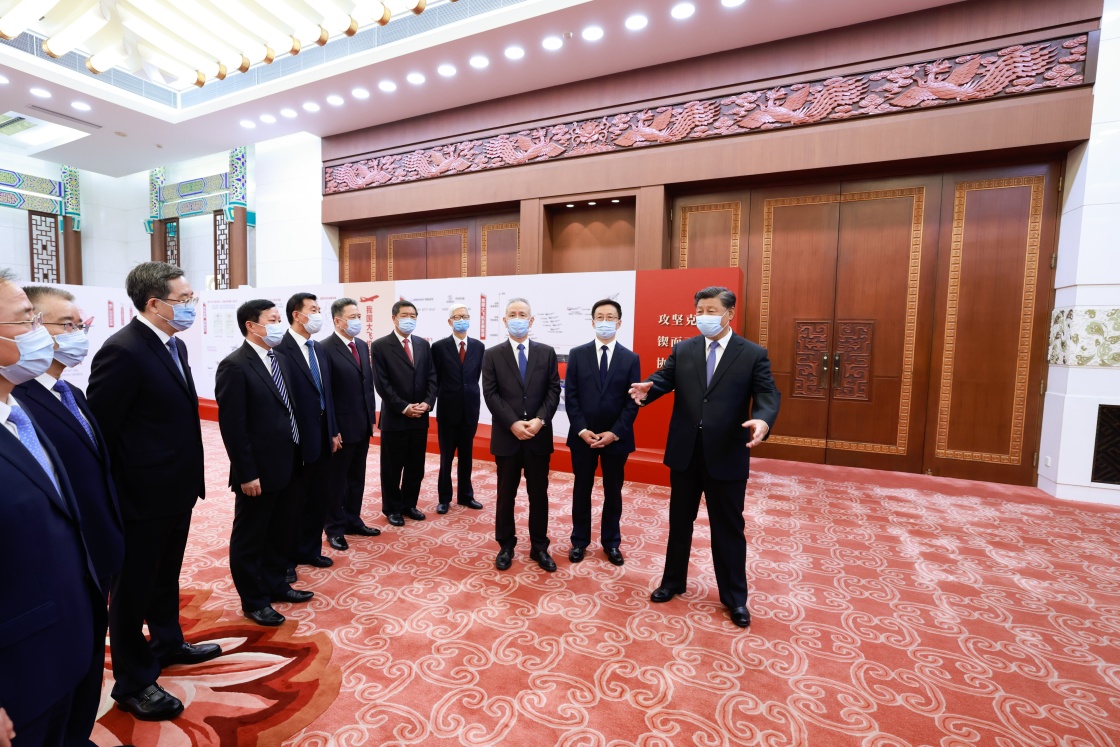 9月30日,黨和國家領(lǐng)導人習近平、韓正等在北京人民大會堂會見C919大型客機項目團隊代表并參觀項目成果展覽。這是習近平等參觀項目成果展覽。新華社記者 李學仁 攝