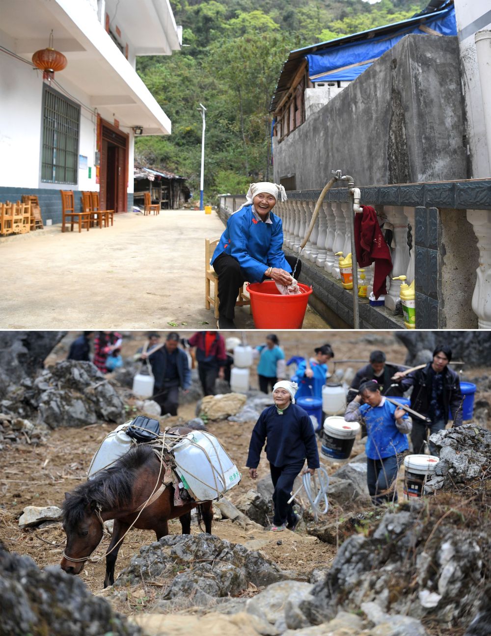 ↑拼版照片上圖:廣西百色市那坡縣龍合鄉(xiāng)明浪村弄蓬屯村民韋秀海用自來水洗衣服(2021年3月10日攝);下圖:2010年3月29日,韋秀海(前)和村民一起走在取水的山間小路上。10多年來,尤其是實(shí)施精準(zhǔn)扶貧以來,廣西為留住地表水艱苦奮戰(zhàn),將水引進(jìn)千家萬戶,徹底改變了大石山區(qū)肩挑馬馱的用水狀況,為鄉(xiāng)村振興打下堅(jiān)實(shí)的基礎(chǔ)。