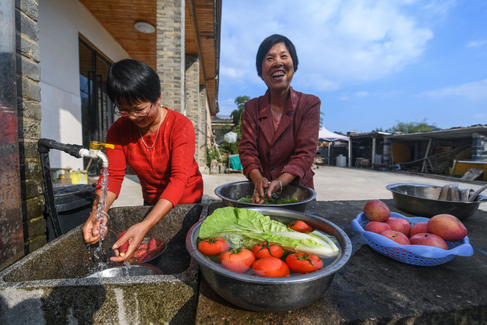 ↑2020年10月10日,浙江省杭州市臨安區(qū)天目山鎮(zhèn)九獅村村民在家門口用剛接通不久的自來水洗菜。2018年以來,杭州市臨安區(qū)以管網(wǎng)擴(kuò)網(wǎng)、聯(lián)村供水工程為主,單點(diǎn)補(bǔ)充為輔,通過規(guī)?;惺焦┧こ探ㄔO(shè),讓鄉(xiāng)村百姓用上便捷的“放心水”。