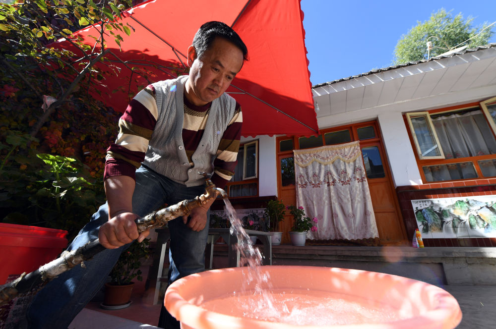 ↑2016年10月17日,甘肅省臨夏回族自治州臨夏市城郊鎮(zhèn)肖家村村民使用引黃濟(jì)臨供水工程的自來水。