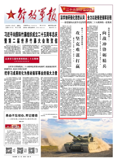 該旅政委王振棟告訴記者,黨的二十大勝利閉幕后,他們迅速召開黨委會,專題研究部署學(xué)習(xí)宣傳貫徹黨的二十大精神;采取原原本本系統(tǒng)學(xué)、領(lǐng)導(dǎo)干部帶頭學(xué)、官兵分層全員學(xué)、濃厚氛圍牽引學(xué)、網(wǎng)絡(luò)助力全時(shí)學(xué)等方式,幫助官兵全面掌握黨的二十大精神,激發(fā)練兵備戰(zhàn)熱情。