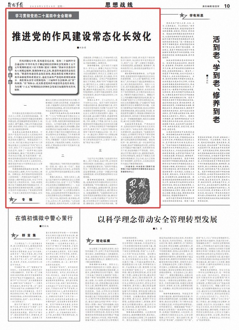 作風問題無小事,黨風建設無止境。黨的二十屆四中全會通過的《中共中央關于制定國民經(jīng)濟和社會發(fā)展第十五個五年規(guī)劃的建議》(以下簡稱《建議》)強調:“鍥而不舍落實中央八項規(guī)定精神,狠剎各種不正之風,推進作風建設常態(tài)化長效化?!蓖七M作風建設常態(tài)化長效化,既是我們黨不斷開辟自我革命新境界的重要法寶,也是全面從嚴治黨的重要組成部分。我們要認真學習貫徹黨的二十屆四中全會精神,以“?!钡捻g勁、“長”的恒心,扎實推進黨的作風建設常態(tài)化長效化,為實現(xiàn)“十五五”時期國民經(jīng)濟和社會發(fā)展目標提供堅實作風保障。