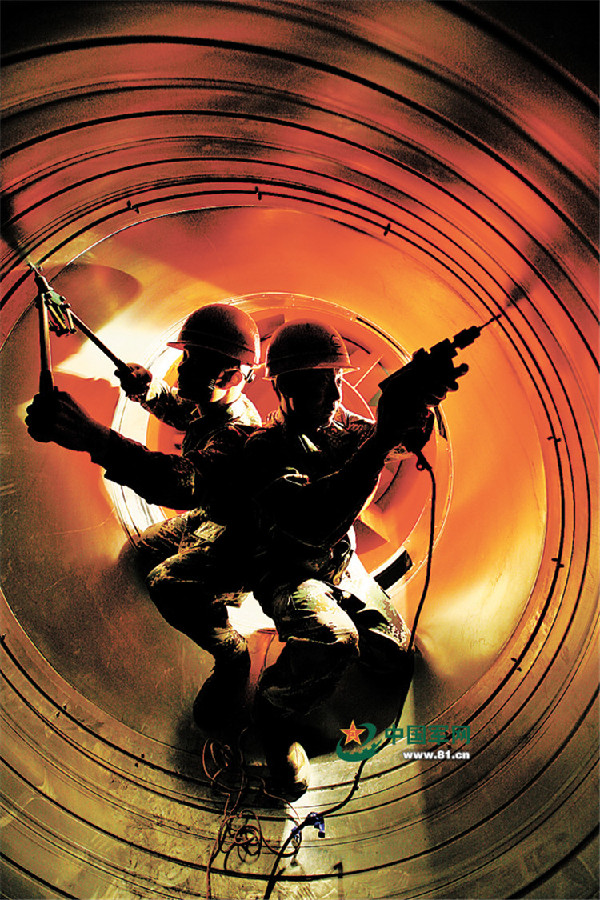有些官兵在崗位上默默無聞奉獻(xiàn),比如那些被稱為構(gòu)筑“地下長城”的人。圖為風(fēng)管安裝骨干正在對(duì)風(fēng)管進(jìn)行鉚接。