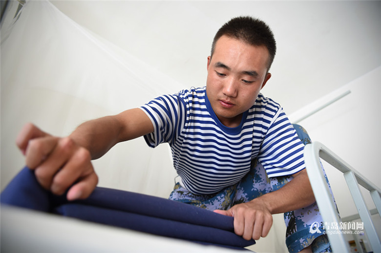學(xué)校對(duì)海軍國(guó)防生的內(nèi)務(wù)要求很高,平日里兩天一小查,三天一大查。回到宿舍的劉振還不忘整理一下他的“豆腐塊”被子。