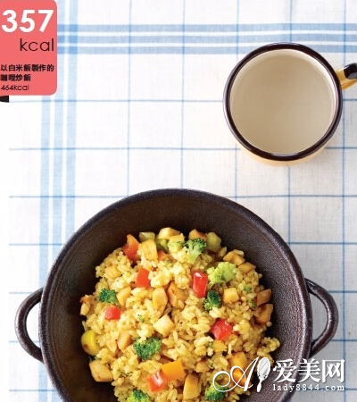 材料:雞胸肉100g、糙米飯1/3碗、紅椒少許、黃椒少許、花椰菜、咖喱粉1大匙、橄欖油