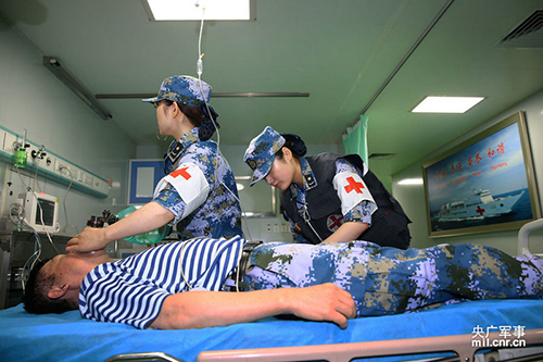 參加“環(huán)太平洋—2014”任務(wù)的和平方舟醫(yī)院船進(jìn)行災(zāi)難醫(yī)療救援演練,醫(yī)務(wù)人員正在對(duì)傷病員進(jìn)行檢傷分類。