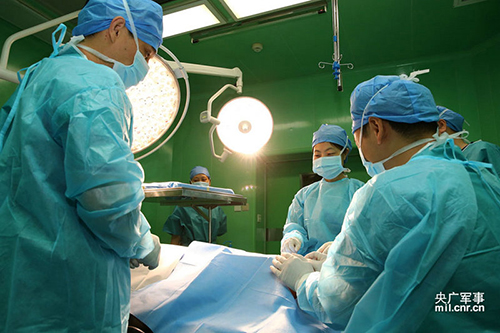 參加“環(huán)太平洋—2014”任務的和平方舟醫(yī)院船進行災難醫(yī)療救援演練,手術室正在進行模擬手術。