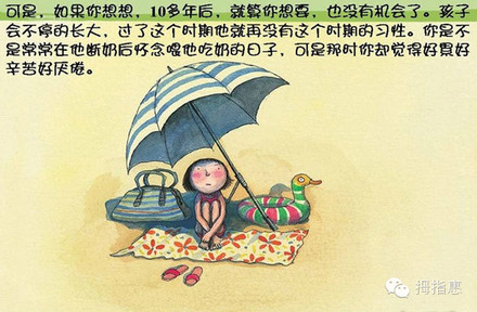 可是,如果你想想,10多年后,就算你想要,也沒有機(jī)會(huì)了。孩子會(huì)不停地成長(zhǎng),過了這個(gè)時(shí)期就再?zèng)]有這個(gè)時(shí)期的習(xí)性。你是不是常常在孩子斷奶后懷念喂他吃奶的日子,可是那時(shí)你卻覺得好累、好辛苦、好厭倦。