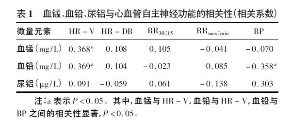 研究以某面粉廠34位正常人為研究對象,其中男性19位,女性15位,年齡為22歲~46歲,平均年齡為33.47歲±7.37歲。心血管自主神經(jīng)功能檢測采用EwingDJ推薦的心血管自主神經(jīng)功能測試(ANS功能檢測),主要包括以下幾個方面:ValaslvaManoeuvRe心率反應(yīng)(HR-V)、深呼吸時(shí)的心率變化(HR-DB)、即立心率反應(yīng)間隔(HR-IS)以及血壓差BP。神經(jīng)行為核心測驗(yàn)組合采用WHO推薦的神經(jīng)行為核心測驗(yàn)組合,包括情感狀態(tài)測試、簡單反應(yīng)時(shí)測試、數(shù)字廣度測試、手提轉(zhuǎn)速度測試、數(shù)字譯碼測試、視覺保留記憶測試、目標(biāo)追蹤測試7個方面,以測試研究對象的情感狀態(tài)、注意力、反應(yīng)速度、聽記憶、手工操作敏捷度、感知-運(yùn)動速度、視感知、記憶和運(yùn)動穩(wěn)定性功能。微量元素檢測采集研究對象清晨空腹的血樣和尿樣,用石墨爐原子吸收分光光度法測定血錳濃度、血鉛濃度和尿鋁濃度。