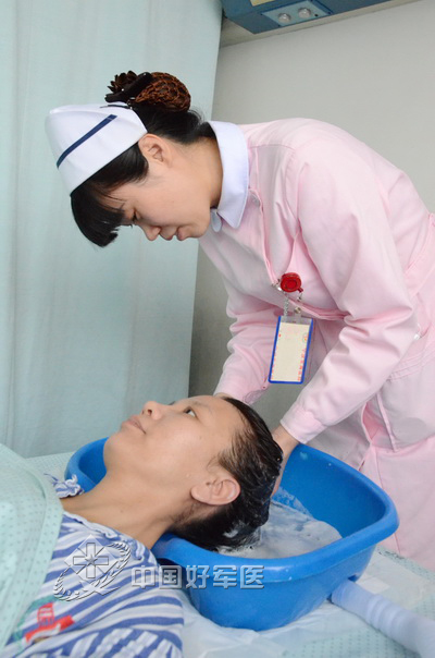 由于動彈牽扯手術(shù)傷口,章映娟術(shù)后十多天一直無法洗頭。護(hù)士長李俐與姐妹們,買來便攜式洗頭器具,為她洗頭、編辮子,每天把她打扮得美美的。