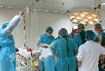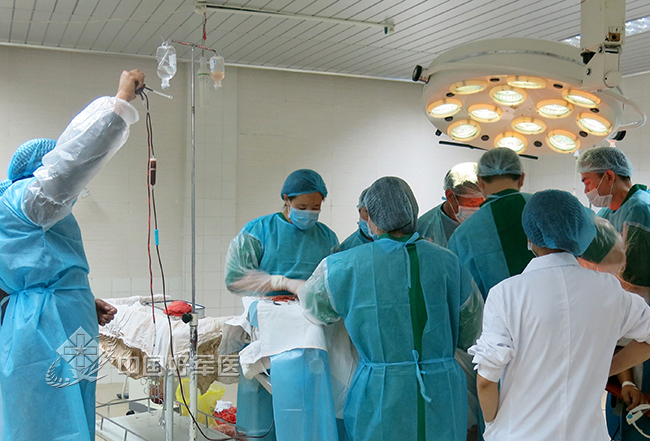 經(jīng)短暫商議,醫(yī)療隊決定就在醫(yī)院手術(shù)室實施搶救。8時10分,術(shù)前準備工作到位,給予傷者吸入性全麻,于秀峙副主任醫(yī)師、郝立校副主任醫(yī)師帶領(lǐng)縣醫(yī)院的醫(yī)生對傷者行剖腹探查術(shù)。