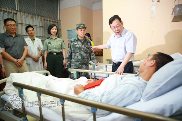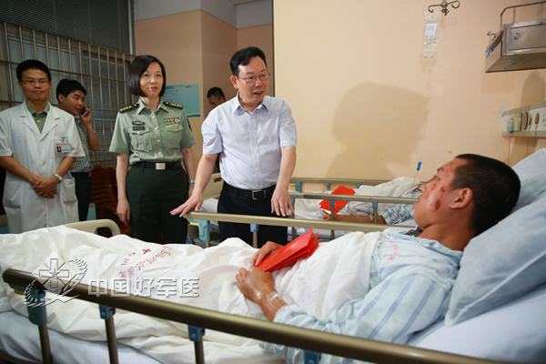 在醫(yī)院蔡華勤政委、急診科張偉主任和機(jī)關(guān)人員的陪同下,劉副秘書(shū)長(zhǎng)一進(jìn)病房便緊緊握住兩位戰(zhàn)士的手,親切地向他們表達(dá)了關(guān)切之情:“你們?cè)诳购閾岆U(xiǎn)中表現(xiàn)得很英勇,于偉國(guó)省長(zhǎng)很惦記你們的傷情,很多群眾也都牽掛著你們的傷情,希望你們?cè)缛栈謴?fù)健康,早日回到戰(zhàn)友的身邊……”