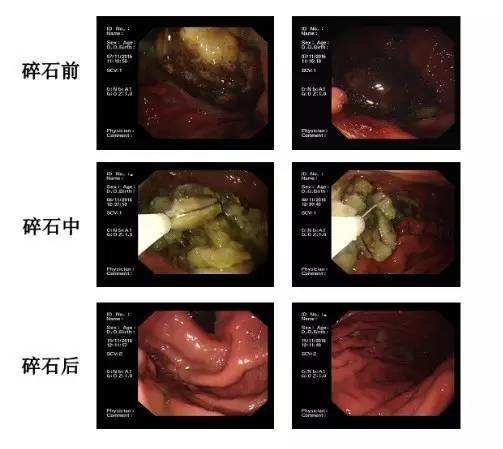 因患者反應較大且結石巨大,遂決定在無痛胃鏡下將結石碎解、取出。在麻醉狀態(tài)下,李明峰主任嫻熟的利用內(nèi)鏡下碎石器、圈套器等微創(chuàng)器械成功將結石碎解并大部取出。術后通過禁食、抑酸、增強胃腸動力等處理,患者腹痛癥狀明顯緩解。一周后復查胃鏡,胃內(nèi)結石完全消失,因結石磨損造成的潰瘍基本愈合。