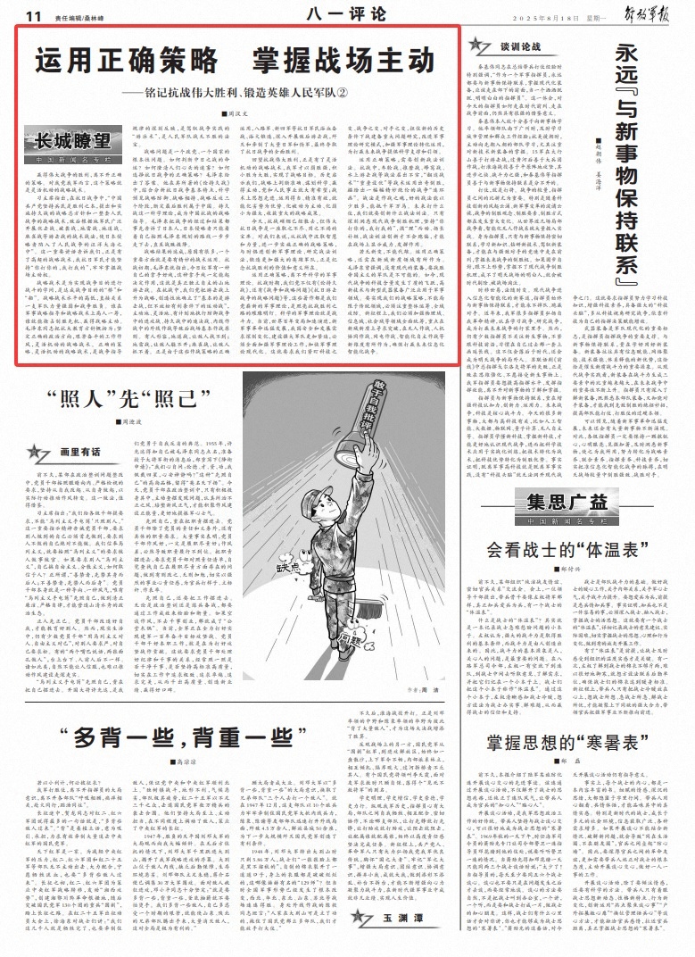 回望抗戰(zhàn)偉大勝利,正是有了靈活機(jī)動(dòng)的戰(zhàn)略戰(zhàn)術(shù),我軍才以弱勝強(qiáng),積小勝為大勝,實(shí)現(xiàn)了戰(zhàn)略目標(biāo)。歷史啟示我們,戰(zhàn)略上判斷準(zhǔn)確、謀劃科學(xué)、贏得主動(dòng),黨和人民事業(yè)就大有希望;戰(zhàn)術(shù)上思想先進(jìn)、運(yùn)用得當(dāng)、精準(zhǔn)有效,就能化劣勢為優(yōu)勢、化被動(dòng)為主動(dòng)、化弱小為強(qiáng)大,收獲重大的戰(zhàn)略成果。