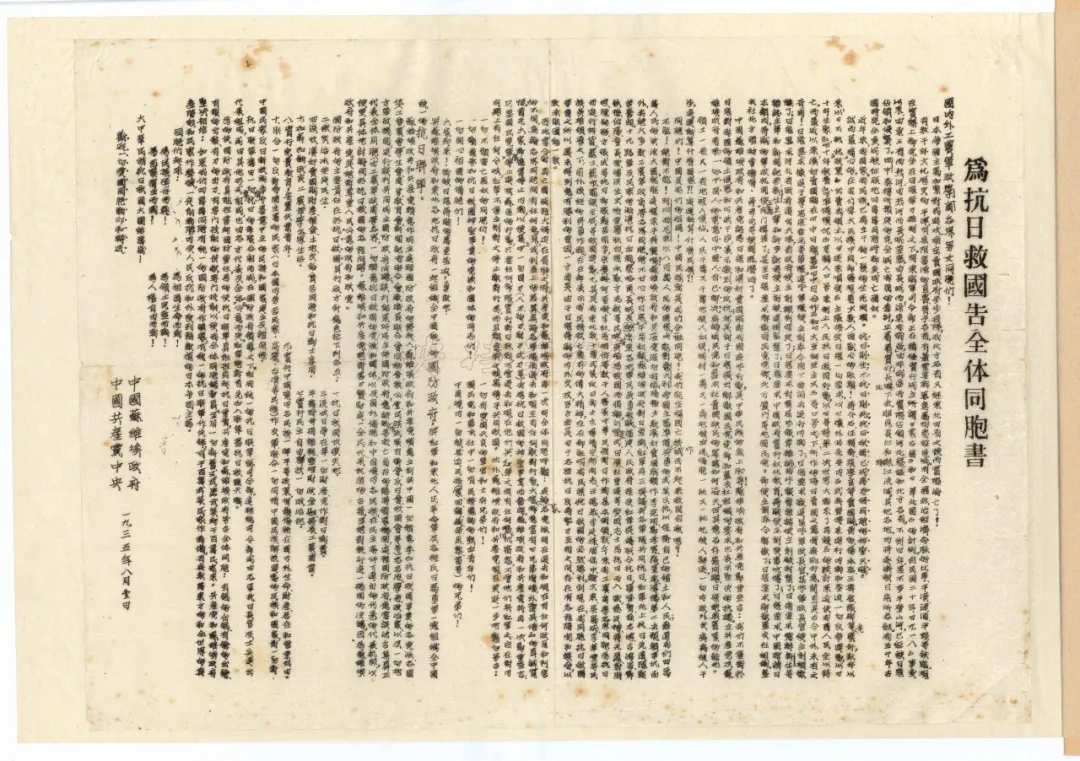 1935年8月1日,《中國(guó)蘇維埃政府、中國(guó)共產(chǎn)黨中央為抗日救國(guó)告全體同胞書》。來(lái)源:中國(guó)檔案雜志