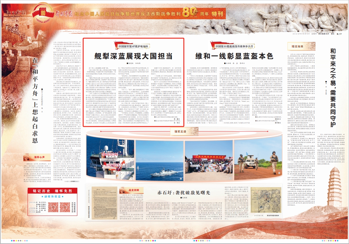 “當年,先輩們與日本侵略者進行頑強不屈的斗爭,為世界反法西斯戰(zhàn)爭勝利作出巨大貢獻;現(xiàn)在,我們駕駛戰(zhàn)艦走向世界為各國船只護航,這是對偉大抗戰(zhàn)精神的傳承。”中國人民抗日戰(zhàn)爭暨世界反法西斯戰(zhàn)爭勝利80周年紀念活動舉行后,看到海軍官兵在天安門廣場接受黨和人民檢閱,編隊官兵熱血澎湃,紛紛表示,要銘記歷史、苦練本領,履行好肩負的使命任務。