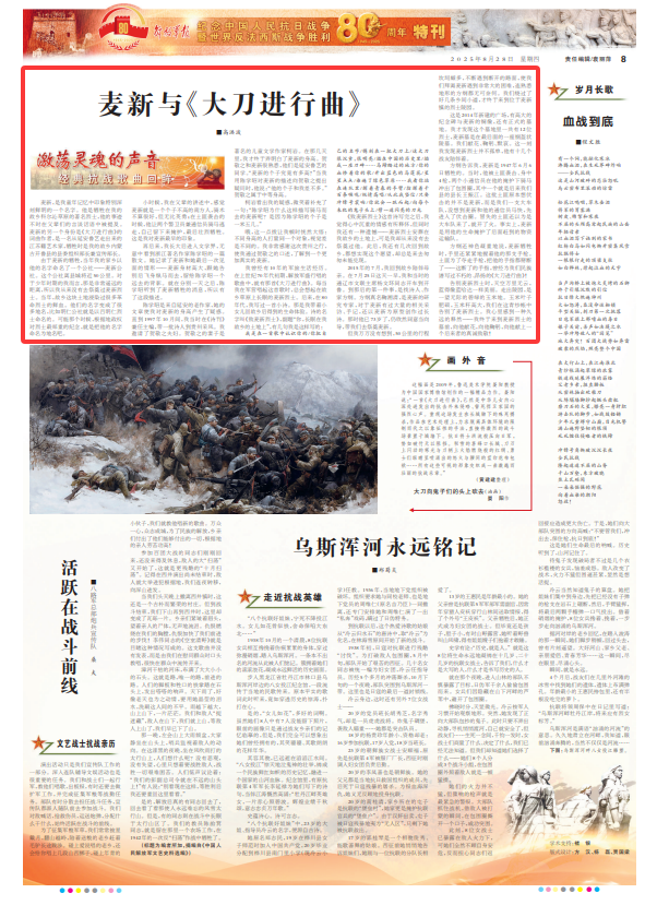 方綱還神色凝重地說,麥新犧牲時,手里還緊緊地握著他的那支手槍。土匪為了奪走手槍,把他的手指都掰斷了——這斷了的手指,曾經(jīng)為我們民族譜寫過不朽的、昂揚的《大刀進行曲》!