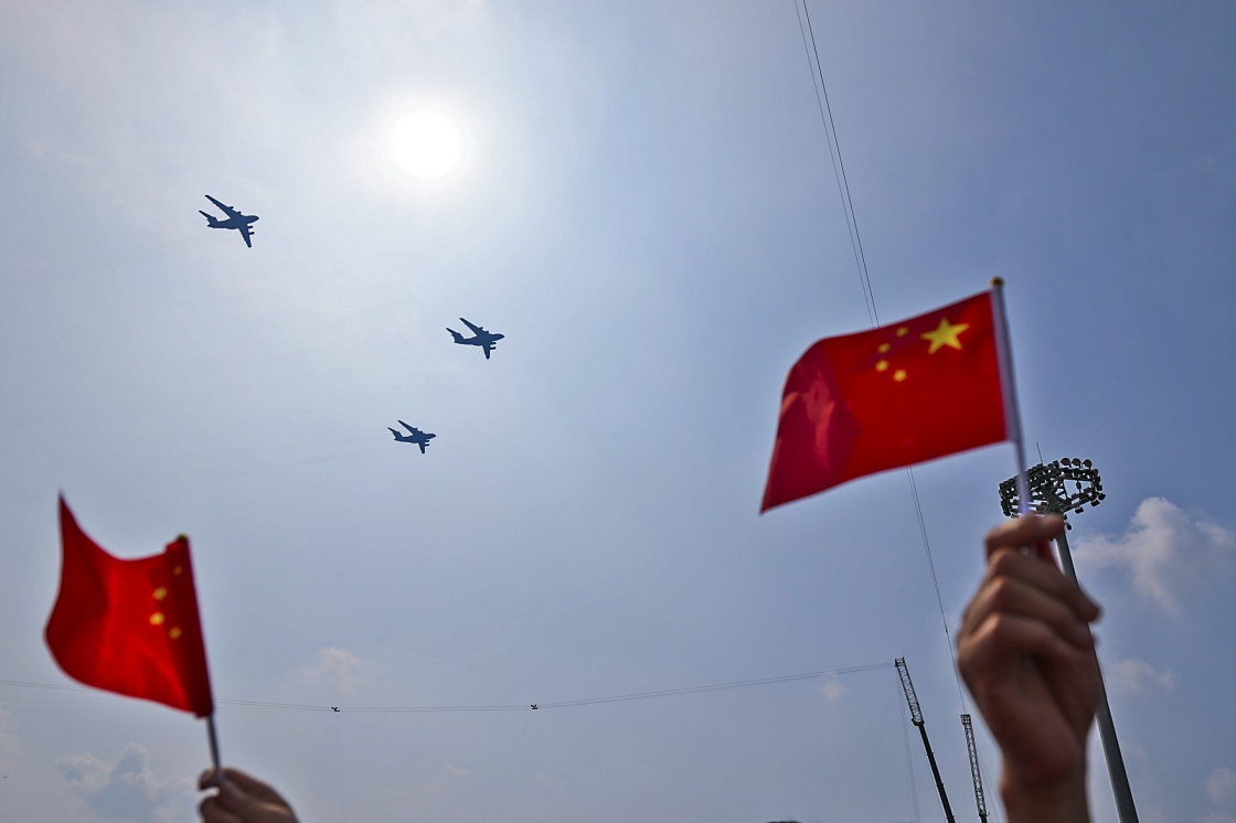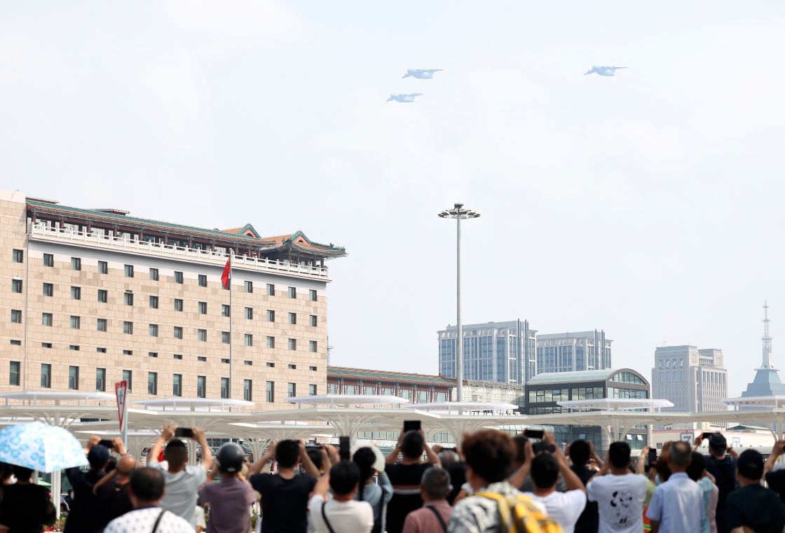 9月3日,紀念中國人民抗日戰(zhàn)爭暨世界反法西斯戰(zhàn)爭勝利80周年大會在北京隆重舉行。這是市民在拍攝運輸機梯隊。