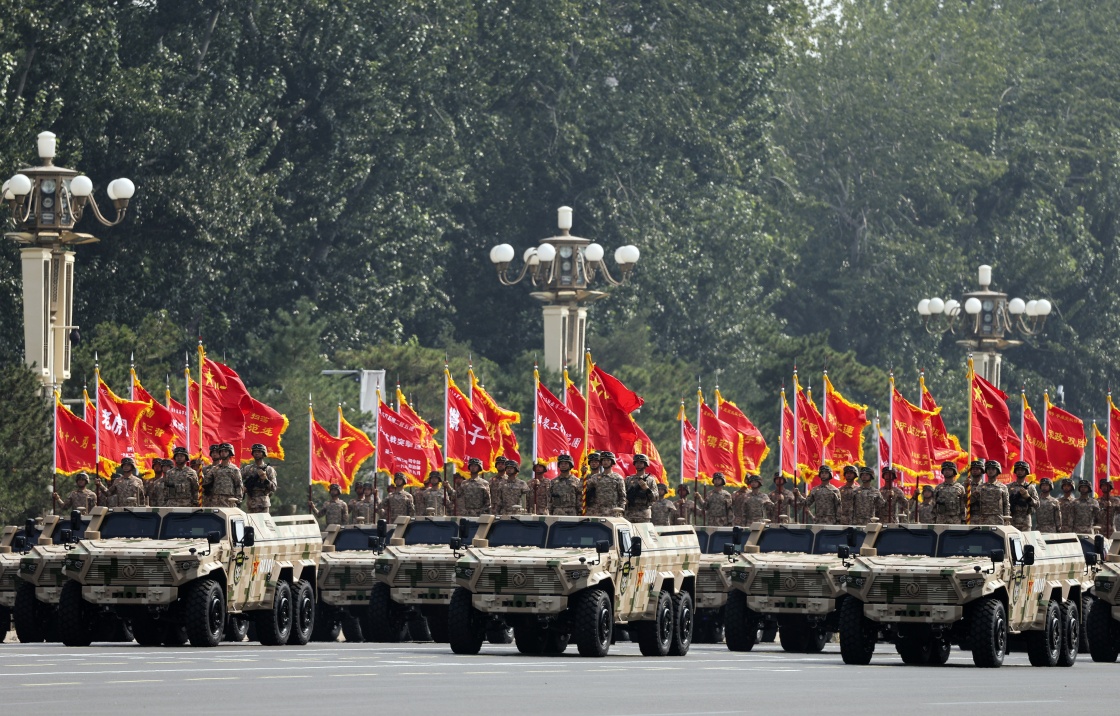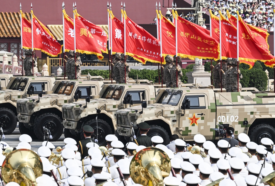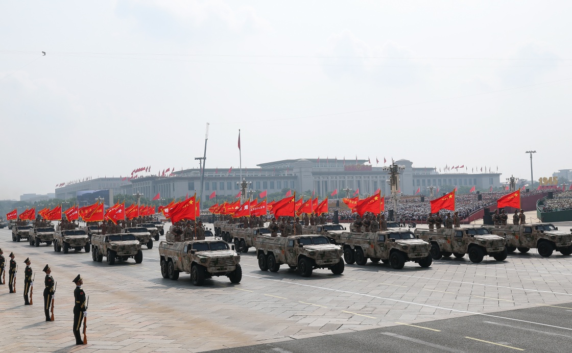 9月3日,紀(jì)念中國(guó)人民抗日戰(zhàn)爭(zhēng)暨世界反法西斯戰(zhàn)爭(zhēng)勝利80周年大會(huì)在北京隆重舉行。這是戰(zhàn)旗方隊(duì)接受檢閱。