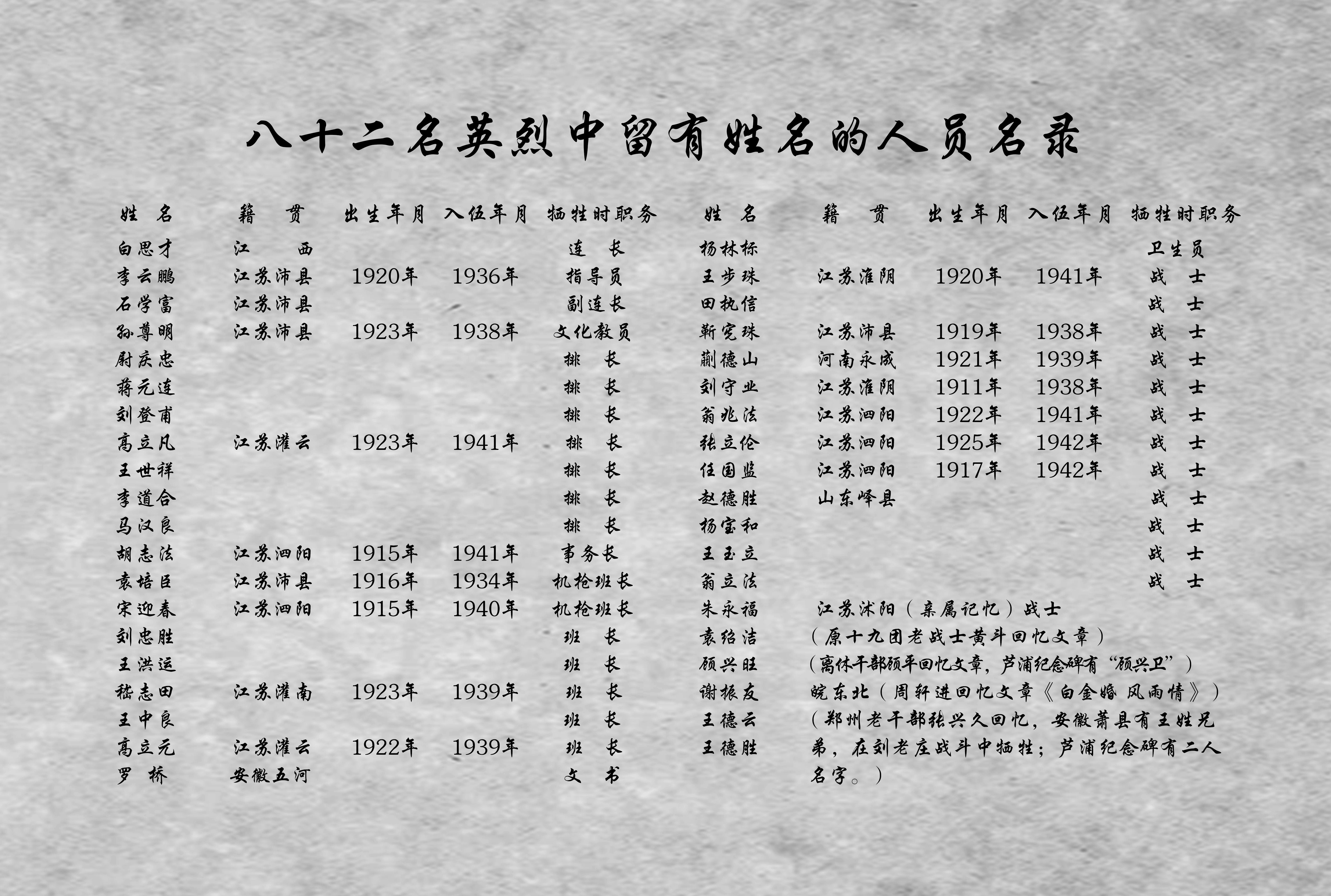 八十二烈士中追溯到留有姓名的人員。(“劉老莊連”史館供圖。)