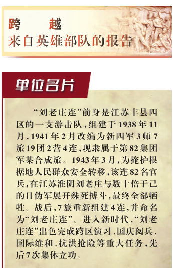 1943年3月,為掩護(hù)根據(jù)地黨政機(jī)關(guān)和人民群眾安全轉(zhuǎn)移,該連前身新四軍3師7旅19團(tuán)2營4連82名官兵,在江蘇淮陰劉老莊與數(shù)十倍于己的日偽軍展開殊死搏斗。戰(zhàn)斗從拂曉打到黃昏,終因敵我力量懸殊,82名勇士全部犧牲。戰(zhàn)后,7旅從當(dāng)?shù)靥暨x82名優(yōu)秀青年,重新組建4連,并命名為“劉老莊連”。