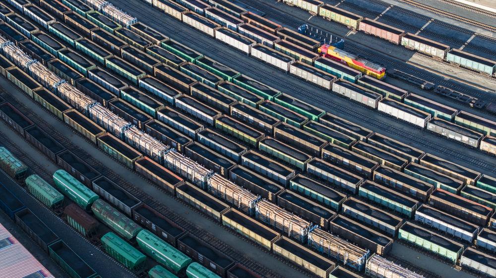 2025年10月18日,在中國(guó)鐵路哈爾濱局集團(tuán)有限公司綏芬河站南場(chǎng),滿載進(jìn)口貨物的列車等待解體換裝(無人機(jī)照片)。新華社發(fā)(曲藝偉 攝)