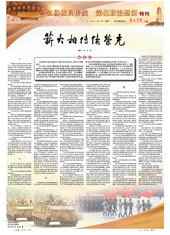 前人肇始,后繼不衰。我黨我軍優(yōu)良傳統(tǒng)之火,在和平建設(shè)時期迸發(fā)著赤誠的火焰,激蕩起開新圖強的奮斗力量。