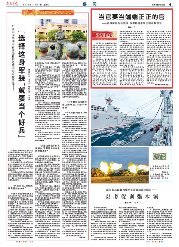 做人要有人品,當(dāng)官要有官德。對軍隊黨員干部來說,當(dāng)端端正正的官,就是要貫徹軍隊好干部標(biāo)準(zhǔn),做到對黨忠誠、善謀打仗、敢于擔(dān)當(dāng)、實(shí)績突出、清正廉潔。在深化政治整訓(xùn)中,軍隊黨員干部應(yīng)嚴(yán)格落實(shí)軍隊好干部標(biāo)準(zhǔn),踐行正確權(quán)力觀、政績觀、事業(yè)觀,加強(qiáng)自我教育、自我塑造、自我培養(yǎng),努力成為德才兼?zhèn)涞母咚刭|(zhì)、專業(yè)化新型軍事人才,牢固立起新時代共產(chǎn)黨人、革命軍人的好樣子。同時,各級黨組織和領(lǐng)導(dǎo)干部也要按照軍隊好干部標(biāo)準(zhǔn)選人用人,切實(shí)把那些端端正正的黨員干部選出來、用起來。