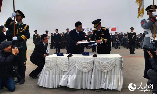 中方交接在韓志愿軍烈士遺骸代表團(tuán)團(tuán)長、民政部優(yōu)撫安置局局長鄒銘與韓方代表、韓國國防部軍備控制次長文尚均準(zhǔn)將現(xiàn)場簽署了交接書,確認(rèn)交接437具志愿軍烈士遺骸以及相關(guān)遺物。黃海燕攝