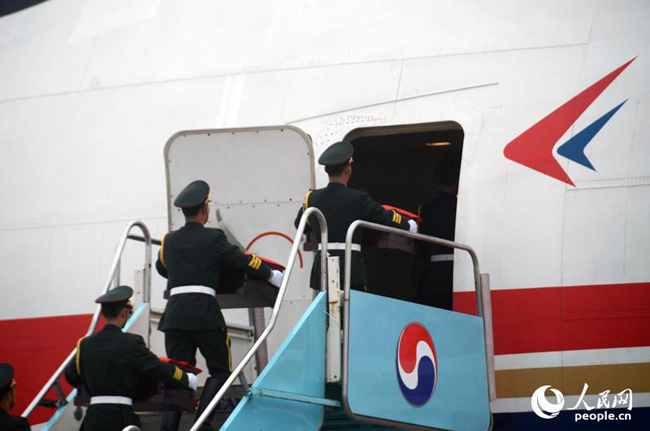 烈士遺骸由中方禮兵護(hù)送登上運(yùn)送遺骸專機(jī)。黃海燕攝