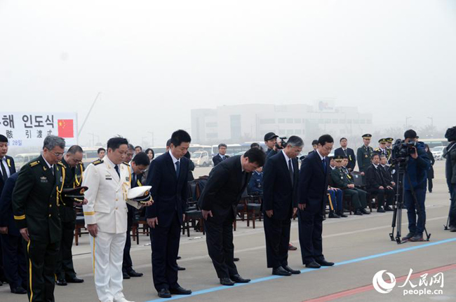 中方代表團(tuán)向烈士遺骸鞠躬。張悅攝