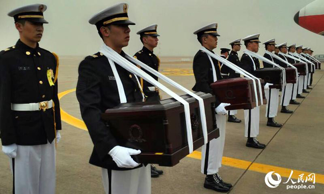 韓方人員手捧烈士遺骸棺木。黃海燕攝