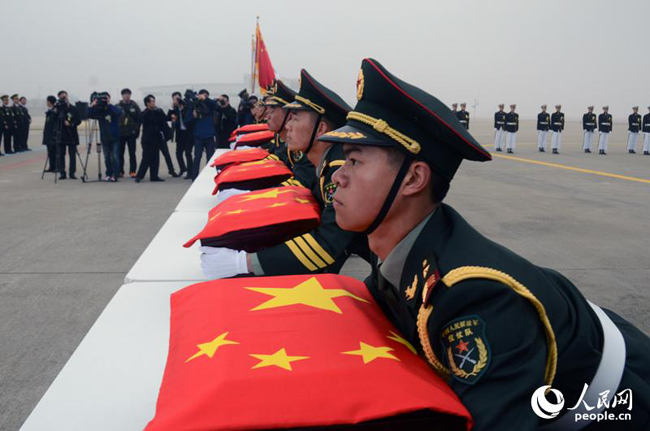 志愿軍烈士的遺骸蓋上了鮮艷的五星紅旗。張悅攝