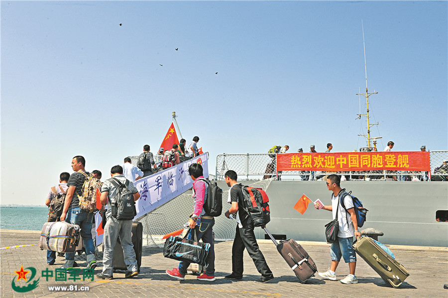 2015年3月,在也門(mén)撤僑行動(dòng)中,中國(guó)同胞登上海軍臨沂艦。熊利兵攝
