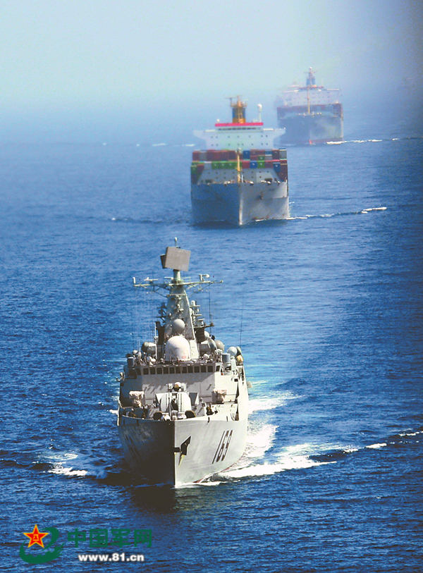 2009年1月6日,海軍首批護(hù)航編隊(duì)在亞丁灣為中國(guó)商船護(hù)航。李 唐攝