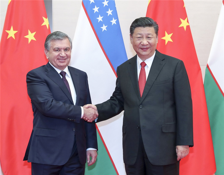 6月9日,國(guó)家主席習(xí)近平在青島會(huì)見烏茲別克斯坦總統(tǒng)米爾濟(jì)約耶夫。新華社記者謝環(huán)馳攝