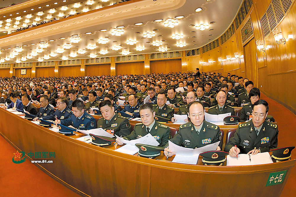 3月5日上午,第十三屆全國(guó)人民代表大會(huì)第一次會(huì)議在北京人民大會(huì)堂開(kāi)幕。圖為軍隊(duì)人大代表認(rèn)真聽(tīng)會(huì)。